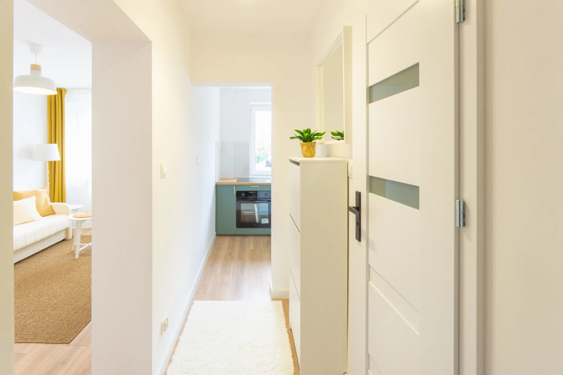 Mieszkanie o powierzchni 33.05m2 składa się z dwóch pokoi, kuchni, łazienki oraz przedpokoju. Wymienione zostały instalacje hydrauliczna i elektryczna. Mieszkanie zostało wyposażone w nowe sprzęty: lodówka w zabudowie, zmywarka, piekarnik, płyta indukcyjna i pralka.